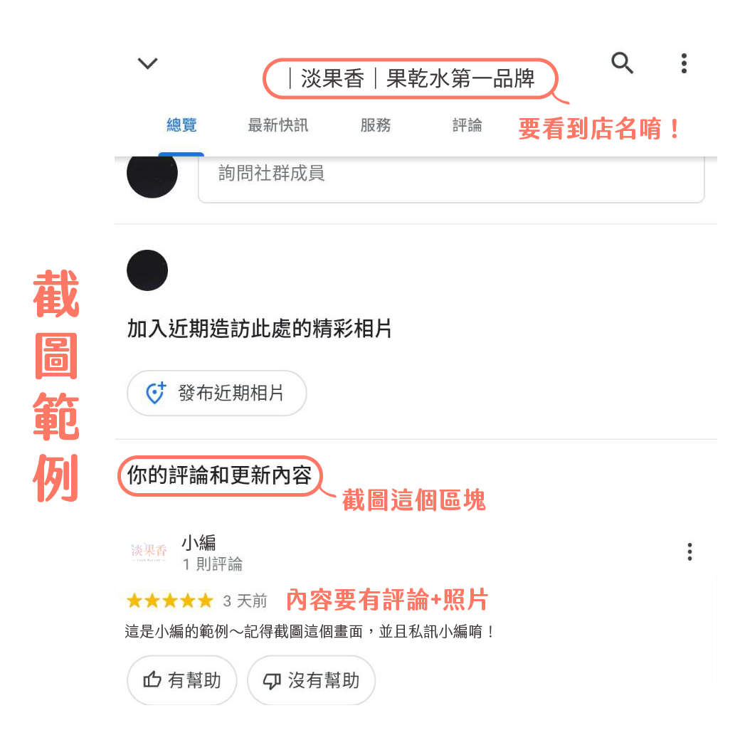 Step3 ▶ 留下您的五星評價+照片(可以上傳產品開箱、到訪門市...等您與淡果香有關聯的照片)